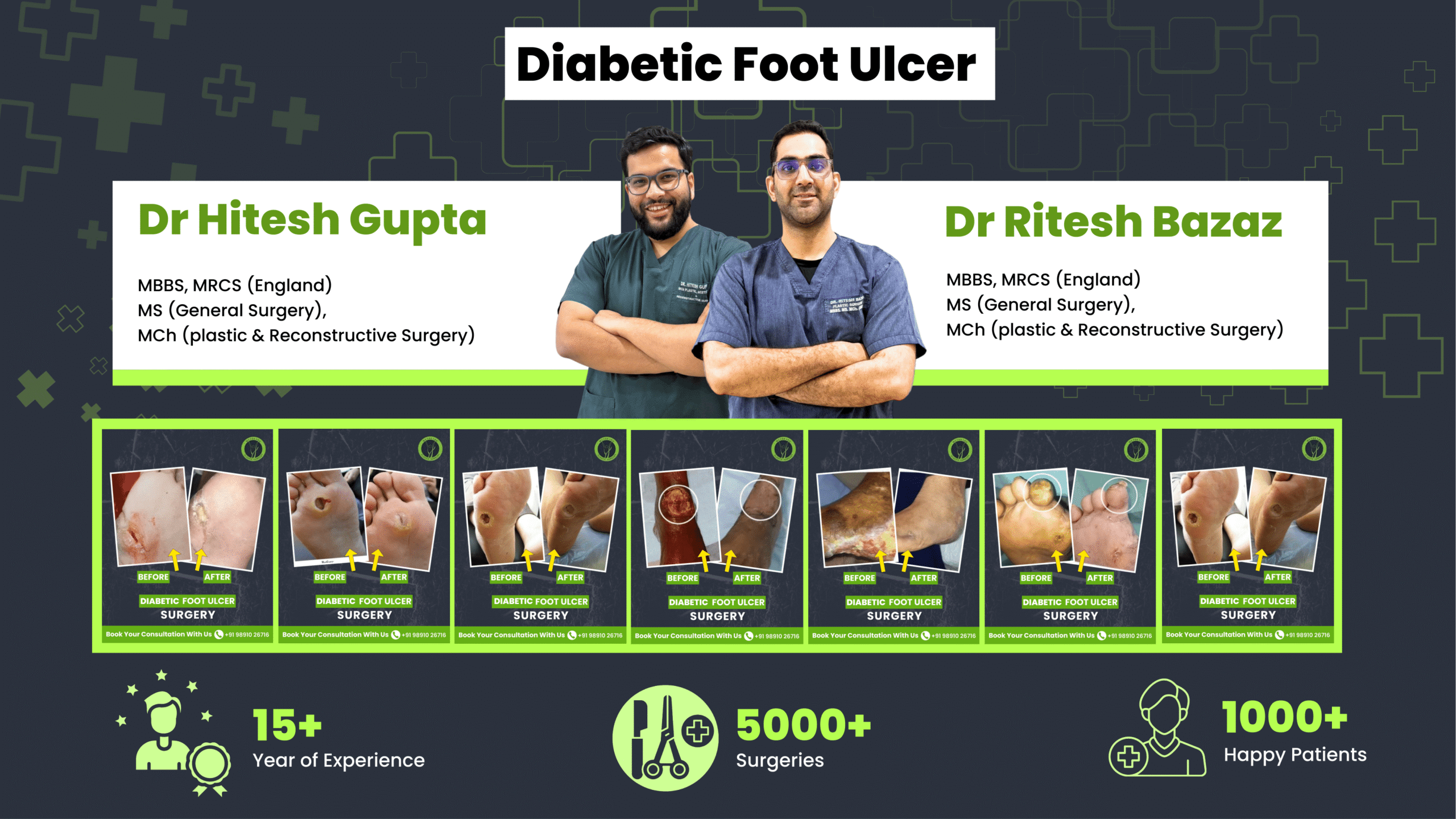 A diabetic foot ulcer is a serious and potentially limb-threatening complication of diabetes. It commonly occurs due to nerve damage (diabetic neuropathy), poor blood circulation, and repeated pressure or minor injuries to the foot. If not treated early and correctly, diabetic foot ulcers can become infected and may lead to prolonged hospitalization or amputation.